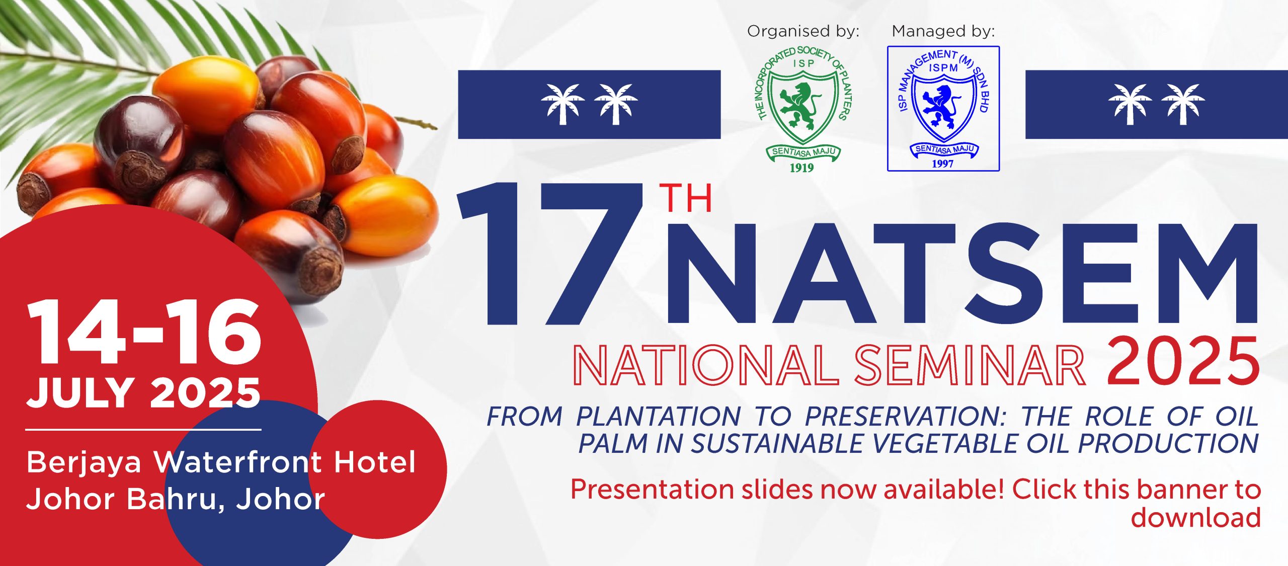 The Incorporated Society of Planters (ISP), will be organizing the 17th National Seminar (NATSEM 2025) on 14 - 16 July 2025 at Berjaya Waterfront Hotel, Johor Bahru, Johor, after a very successful National Seminar in 2024. NATSEM 2025 captures the challenges, trends and developments in the plantation industry especially oil palm, and its future. The national Seminar highlights the theme of “From Plantation to Preservation: The Role of Oil Palm in Sustainable Vegetable Oil Production” and aims to shed light on key aspects crucial for enhancing the economic viability and sustainability of the oil palm industry.